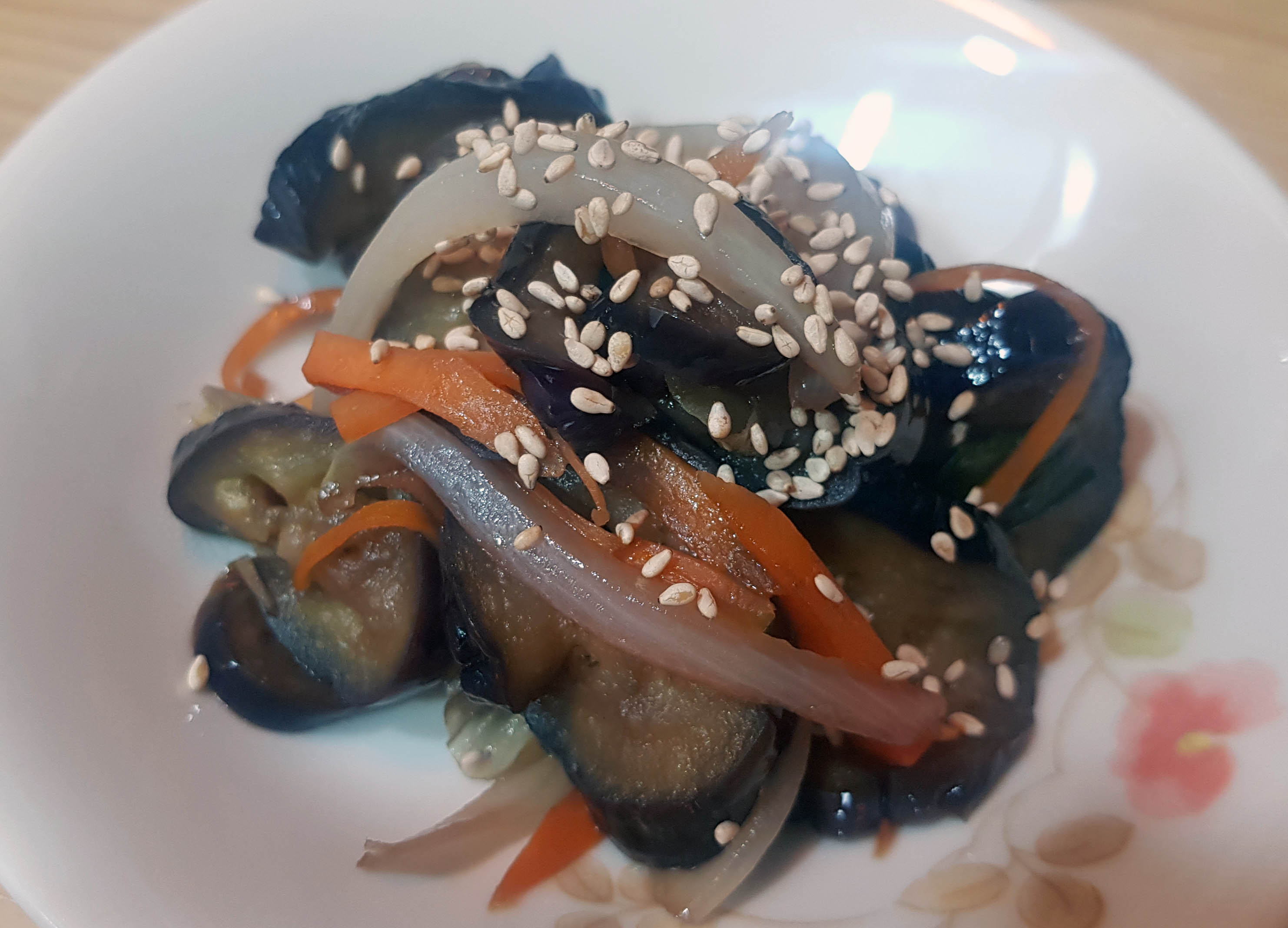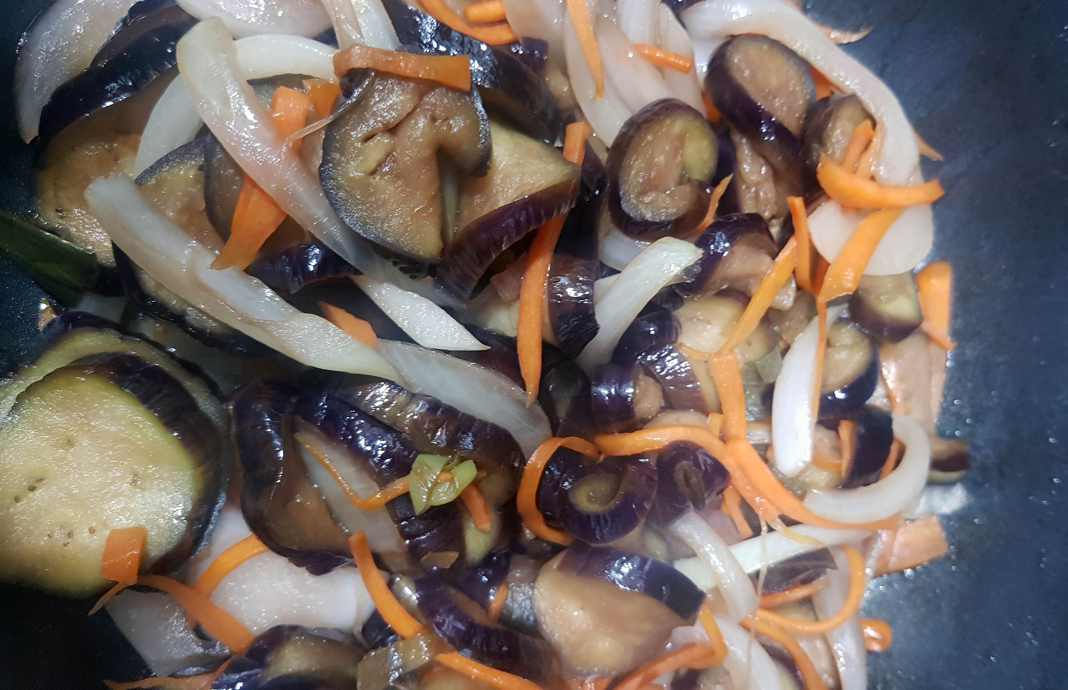 양파를 당근보다 나중에 넣은 이유는 쉽게 익기 때문이예요. 양파가 너무 익으면 식감이 없어지는데, 당근이 절반정도 익었을 때, 양파와 가지를 넣으면 간장소스가 배이면서 식감도 죽지가 않는 듯 해요.