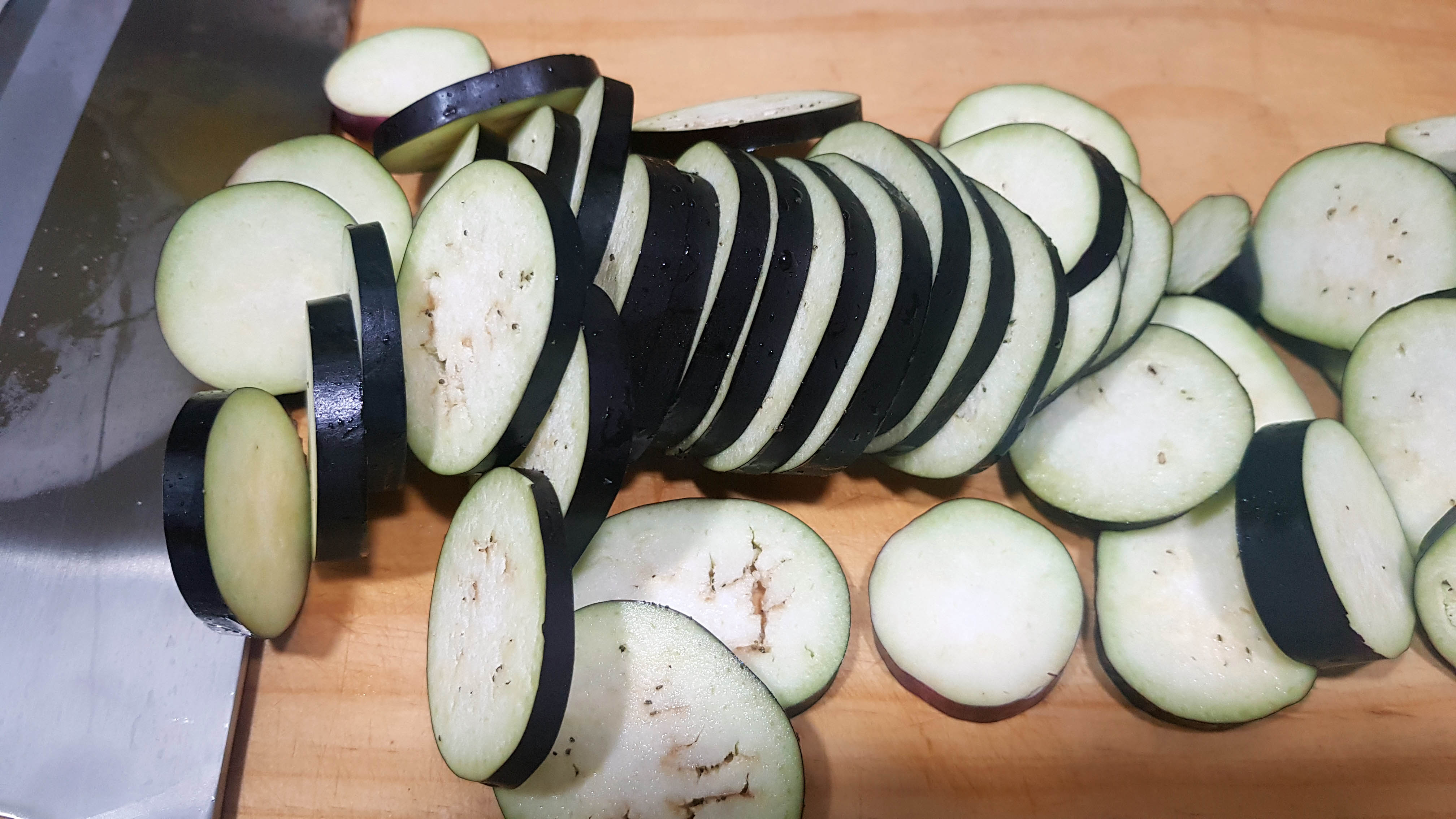 우선 가지 두개를 동그랗게 썰어줍니다. 두께는 한 2~3mm정도의 두께로?