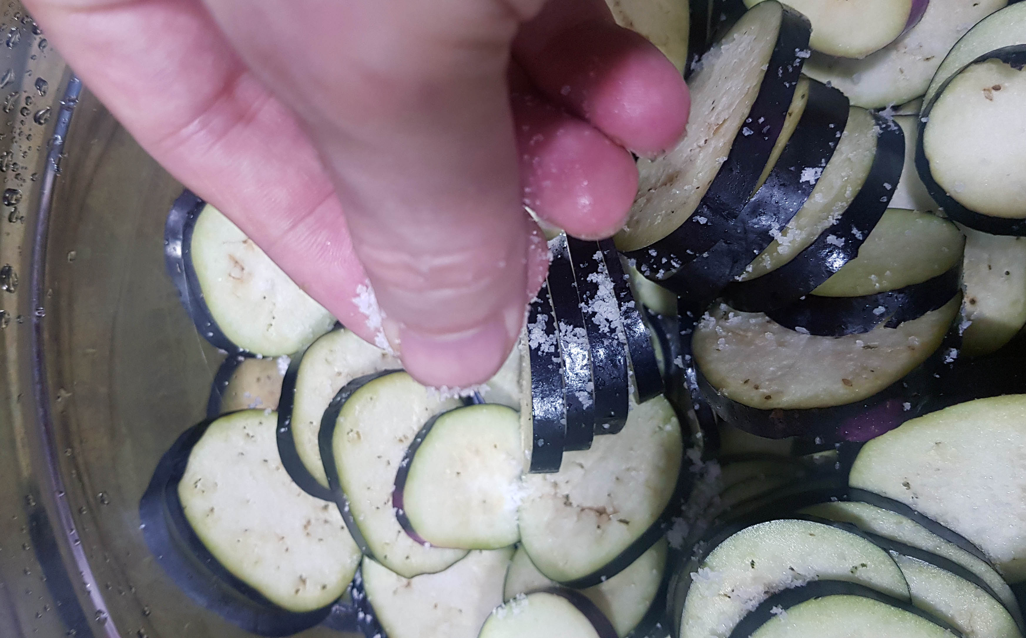 1. 가지를 2~3m로 썰어서 소금에 10~15분 절여준다.