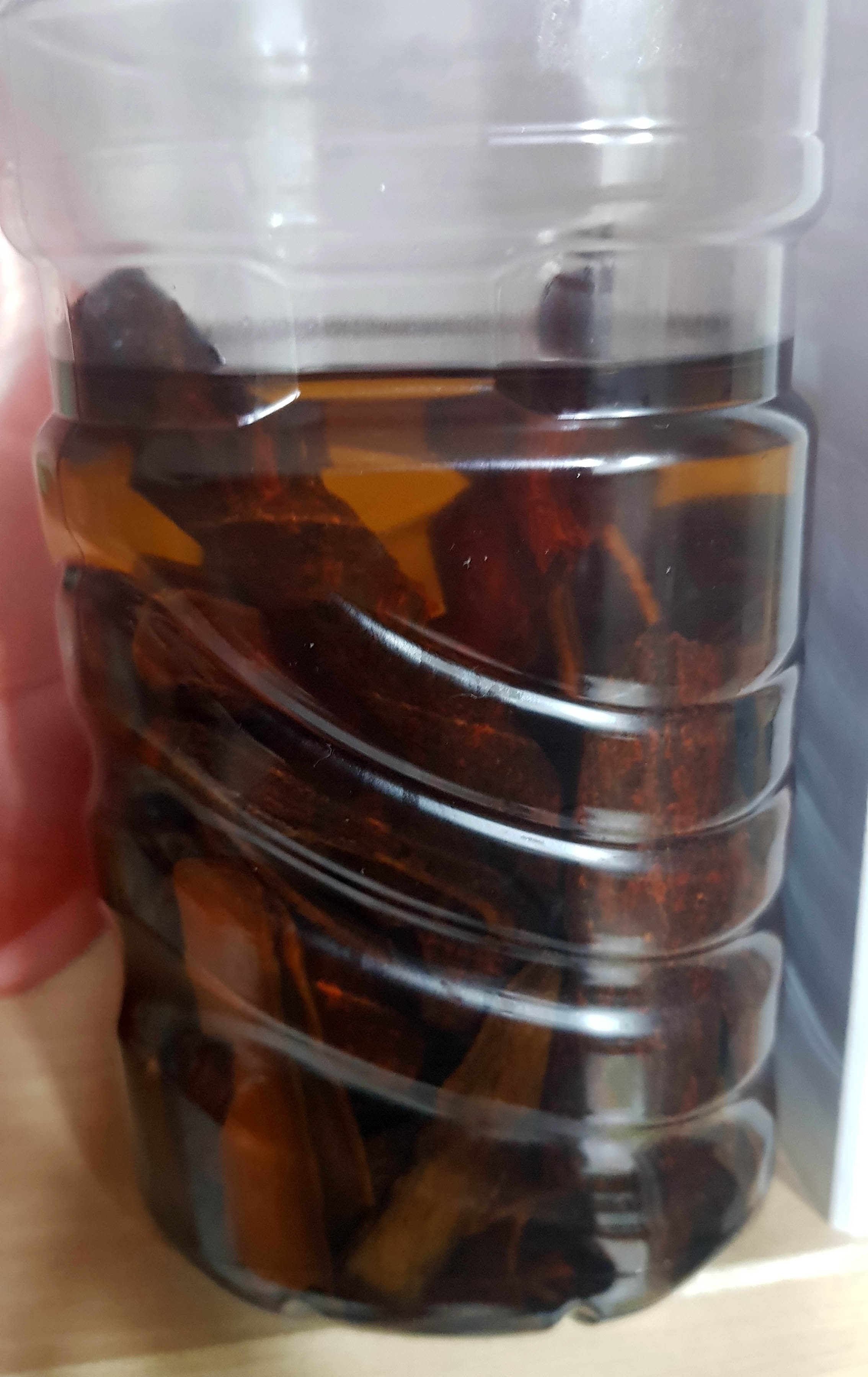 당한 크리로 잘라놓은 계피를 생수통 안에 넣고 소독용 알콜을 부어주면 끝이다.